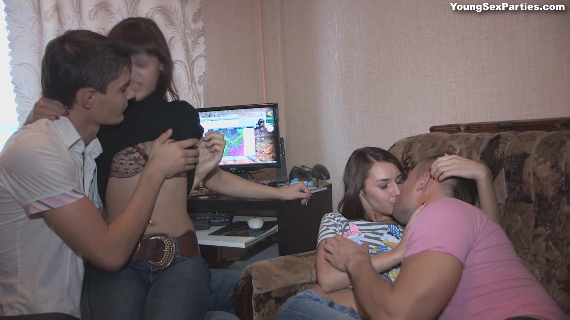 Когда две молодые русские парочки встретились в городе, то они решили, что им стоит отдохнуть всем вместе и они дружно поехали на квартиру. Несмотря на то, что в комнате места было мало и стоял маленький диван, им все равно удалось начать свою оргию вчетвером. Молодые брюнетки сделали парням по минету, помогли их членам полностью подняться и парни устроили им приятный трах дырочек, который закончился спермой в рот.