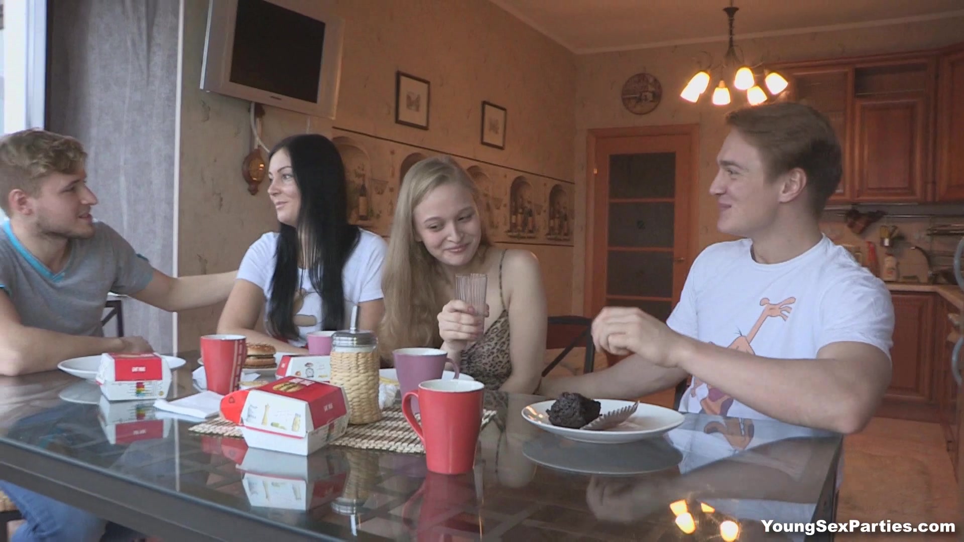 Две молодые русские парни пообедали, а потом лишь только решили о том, что им нужно заняться групповым сексом и сжечь при этом лишние калории, особенно это было нужно представительницам слабого пола, которые якобы следили за своим телом и фигурой. В общем, парни без проблем оприходовали молоденьких развратниц в горячие вагинальные дырочки, которые на тот момент обильно истекали любовными соками. Сучки получили от групповухи нереальное удовольствие, честное слово.
