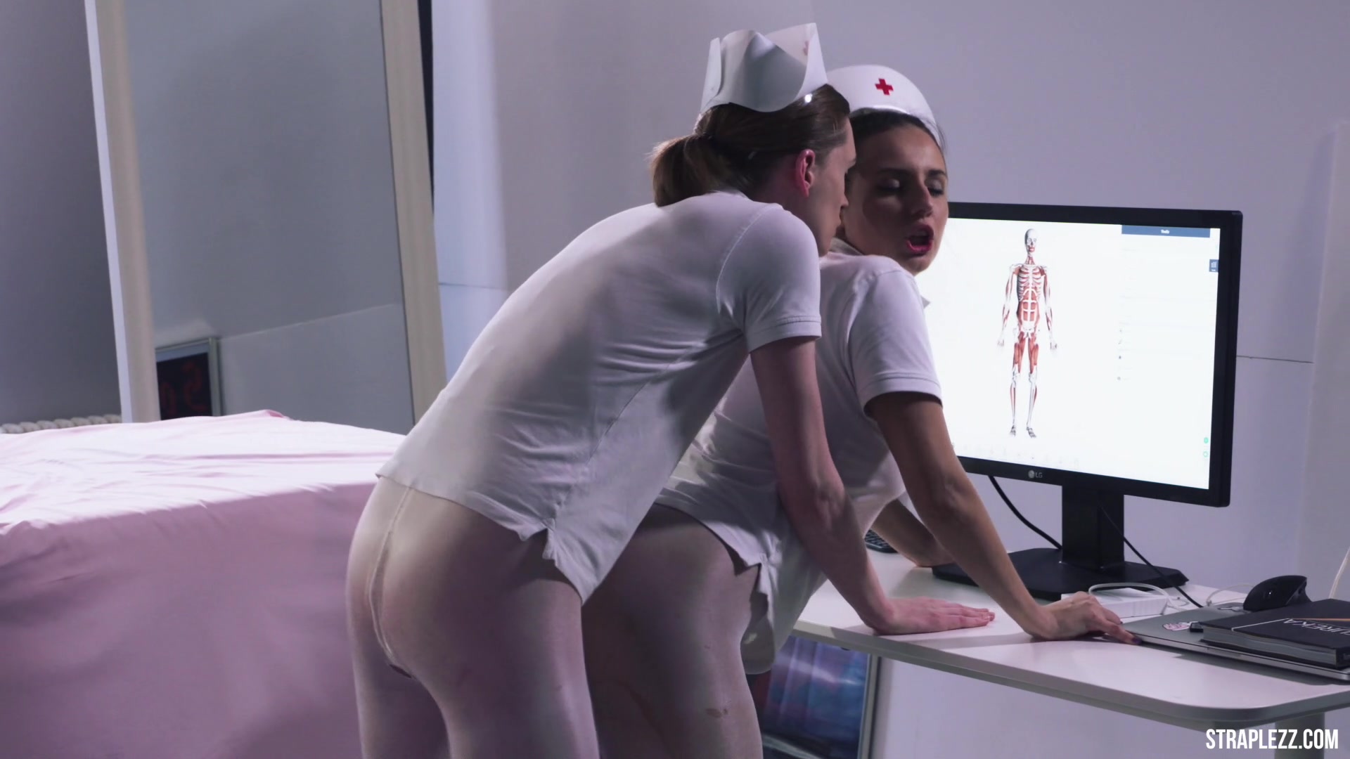 Во время ночного дежурства две сексуальные медсестры-фетишистки устроили показательные и очень откровенные лесбийские развлечения, подчас которых они пользовались большим резиновым страпоном. Одна из девушек в белом халате надела на себя секс игрушку, а вторая красотка в этот момент приняла удобную позу и подготовилась к впусканию страпона внутрь влагалища. Кстати, в самом конце этого действа страпон будет стрелять густой и горячей спермой на медсестру.